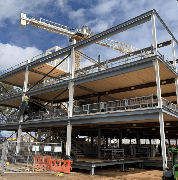 A commercial building project incorporating low-carbon procurement, renewable-energy fabrication, and digital carbon tracking.