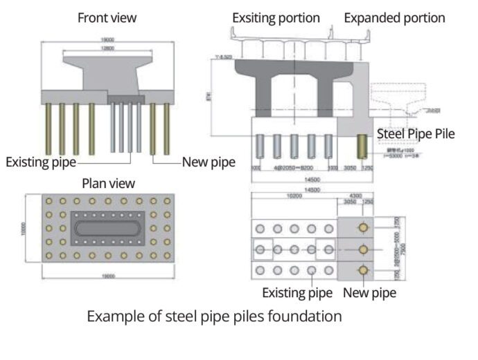 • Foundation resistance can be strengthened with steel pipe sheet piles foundation or additional steel pipe piles driving, in order to address bridge scouring control, structure aging renovation, seismic reinforcement and inadequate strength of the foundation caused by expansion of superstructure, etc.