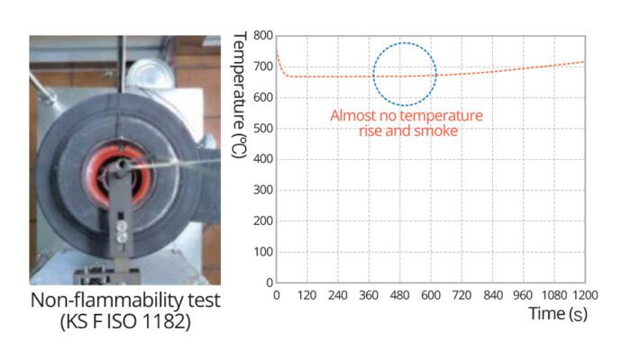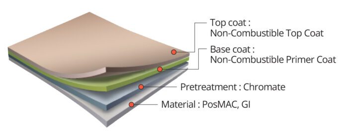 • A colour steel sheet that is highly fire-resistant, producing minimal smoke and harmful gases even at high temperatures. It complies with the non-combustibility performance standards specified by the