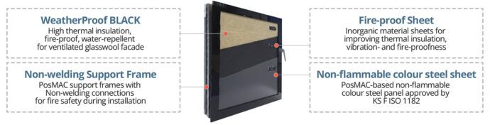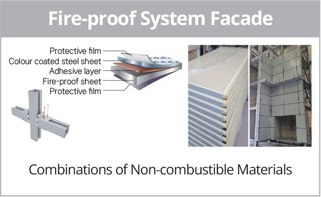 • Fire-safety improved, non-combustible panel solutions as a facade component of system architecture. Flame spread-restraint was improved using non-flammable colour steel sheet and fire-proof material combinations.
