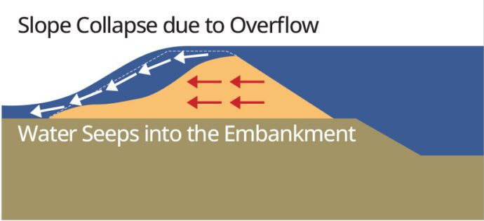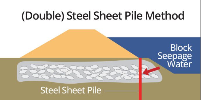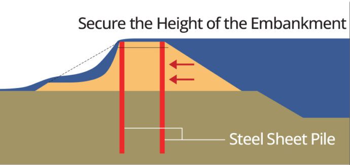 – Double Steel Sheet Piles interrupt the collapse cycle caused by overflow and help maintain embankment height. It also serves to reduce internal water leakage within the embankment body.