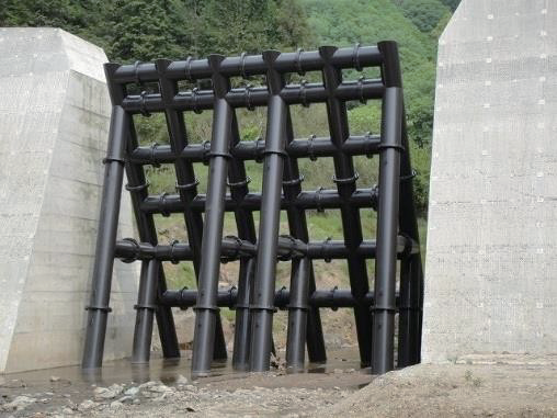 • Slit-type structure built by combining steel pipes, which does not disrupt river flow
