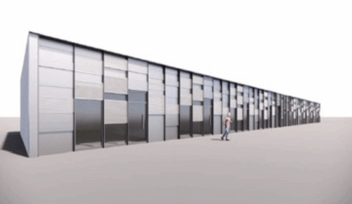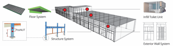 – Includes a column-beam integrated structure with adjustable-height poles (L : 12 m, H : 4.05 m ; 3.3 m during transport, extended to 4.03 m on-site), prefabricated exterior walls with finishing materials, and preassembled infill toilet units.