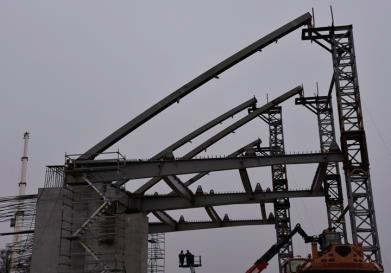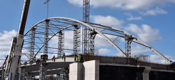 MS-15 viaduct over river Lyna in Olsztyn, Poland, opened in traffic in 2017. Two separate net arch structures, each one with a span of 120m. The arches have a height of 21m, an axis – distance of 13.4m and are realised with hot-rolled profiles HD 400 x 744 and HD 400 x 1086 in HISTAR® 460.