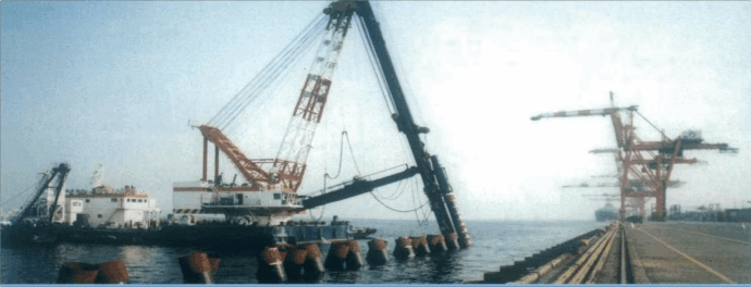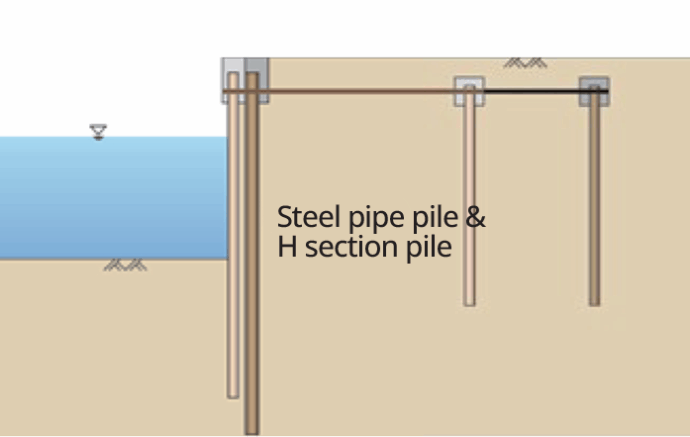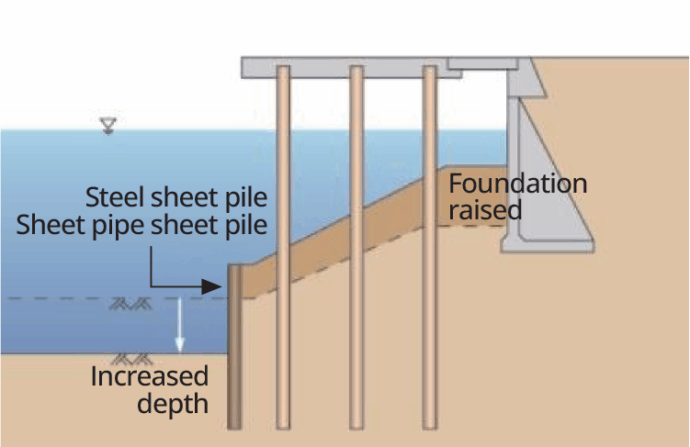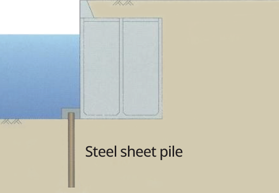 • Construction method employing steel pipe piles and steel pipe sheet piles for increasing size of vessels (increase in port depth), improvement in seismic resistance, and renovation of aged structures.