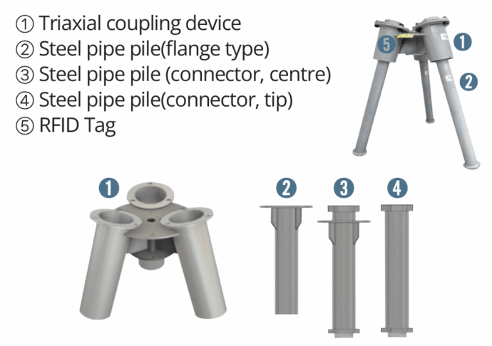 • The triaxial seismic pile is a structure that resists horizontal loads equally in all directions, and has excellent horizontal and vertical resistance.① Triaxial coupling device