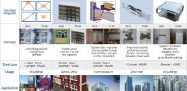 Various types of steel dampers are installed in the building using Low Yield Point steel (HSA80) to control damage to the main beam and column.