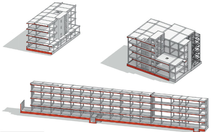 The project makes extensive use of steel truss beams with steel plate bottom cord and on-site poured concrete elements, which is becoming relatively common in Italy even for small and mid-size buildings due to the speed of construction and the absence of temporary support, formwork construction, etc. PREM and NPS beams are the most common commercial products available on the market.
