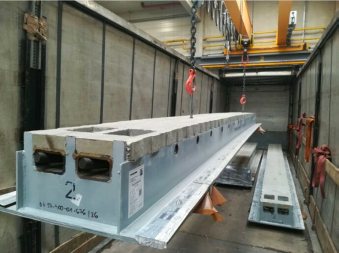 The slim-floor solution consists of a inversed TT steel profile with a bottom flange of 70cm and a thickness of 15mm. The space between the two webs of 8mm each is filled with concrete C60/75. The floor slab is laid on the bottom flange of the TT and consists in hollow core concrete slabs, completed with rebars passing through the composite beam.