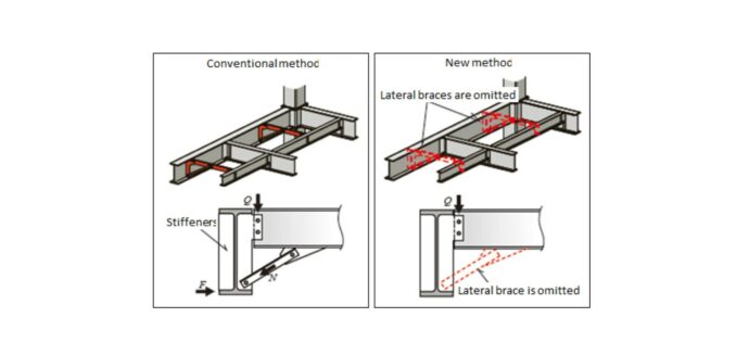 The lateral stiffener omission construction method is an application technology to narrow width cross sections, and a construction method allowing lateral stiffeners to be omitted provided that certain conditions are met in accordance with a newly created proof stress formula with high precision, which takes into consideration the constraining effect from horizontal displacement of the upper flange of the beam given by the constraining effect of the floor slab. Design with rational economics can be realized by taking advantage of these construction methods.
