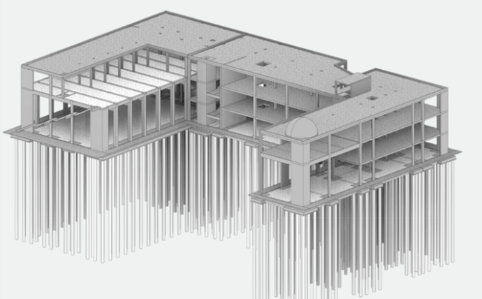 The long span beams of the gym (approx. 20 meters) will be built using a steel-concrete composite truss beam technology with built-in formwork system. The beams have to carry the weight of an additional level above the gym roof and of the accessible terrace on a portion of it.
