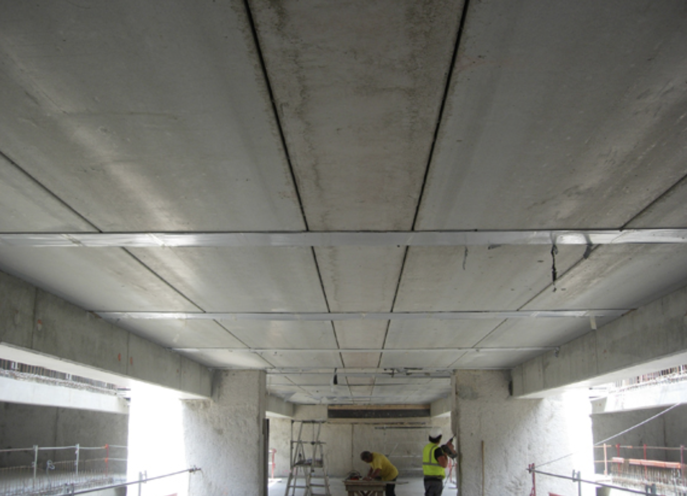 The use of pre-fab beams allowed a faster construction schedule with the top-down method. This created the possibility to cover up the building site giving partial access of the construction site as a public square while construction continued underneath. The specific solution has been adopted also considering the need to reduce as much as possible the floor-to-floor height (it is 3 meters) without limiting the internal free height for vehicle circulation.