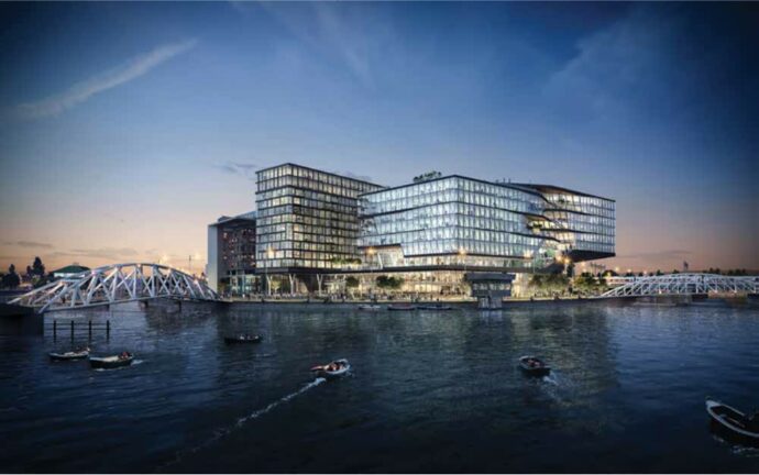 The building is a speculative investment that serves with offices and residences. The Main part is the office building that sits on the curve of one of the main canals in Amsterdam and it is occupied by the headquarters of Booking.com a large on-line travel agency with over 5000 employees. The building is designed with a very complex shape, with the top part elevated from the ground by sculpturally-designed columns. A 25 meter cantilever overlooking the parking entrance is another technical challenge of the building. Many composite elements are present in the building, two are presented here.