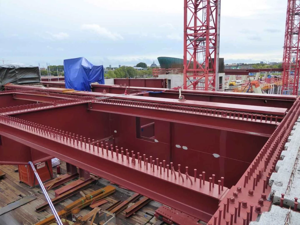 Floor System: above lever 4 the floor system uses a composite system of steel and metal decking with a 300mm thickness over a span of 8.4 meters. The metal decking has a thickness of 1mm with 210 mm of ribs and a compression layer of concrete of 90mm. The metal deck lies on the bottom of the steel beam. In the prefab floor of 320 mm thickness, a recess was provided during installation so that the bottom of the floor and the bottom of the beam correspond with each other. With the steel plate-concrete floor, the floor thickness could be reduced to 300 mm, but with the original bottom flange thickness of 35 mm, the construction height would increase to 335 mm. In order to obtain the required moment capacity and stiffness. To maintain the bottom flange cross-section, it was decided to use a double one bottom flange: the bottom one that supports the steel-plate-concrete floor has a thickness of 20 mm, so that the maximum construction height requirement is now met. The top bottom flange provides the remaining contribution to strength and stiffness.