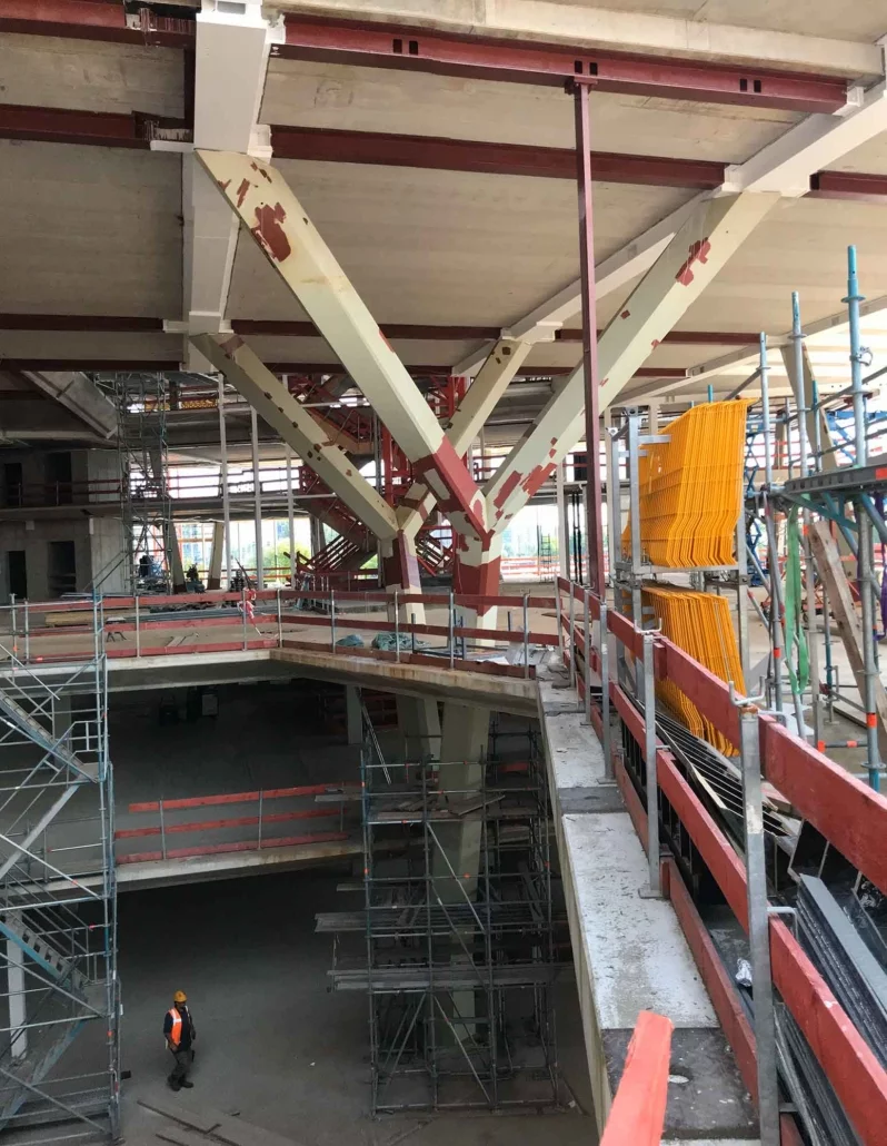 Floor system: The composite system was chosen over the previously-considered prefab concrete cassette floor to avoid delays in the delivery of the cassette floor, and shorten the construction times of the project.