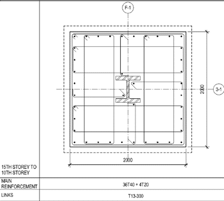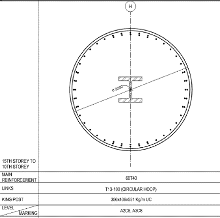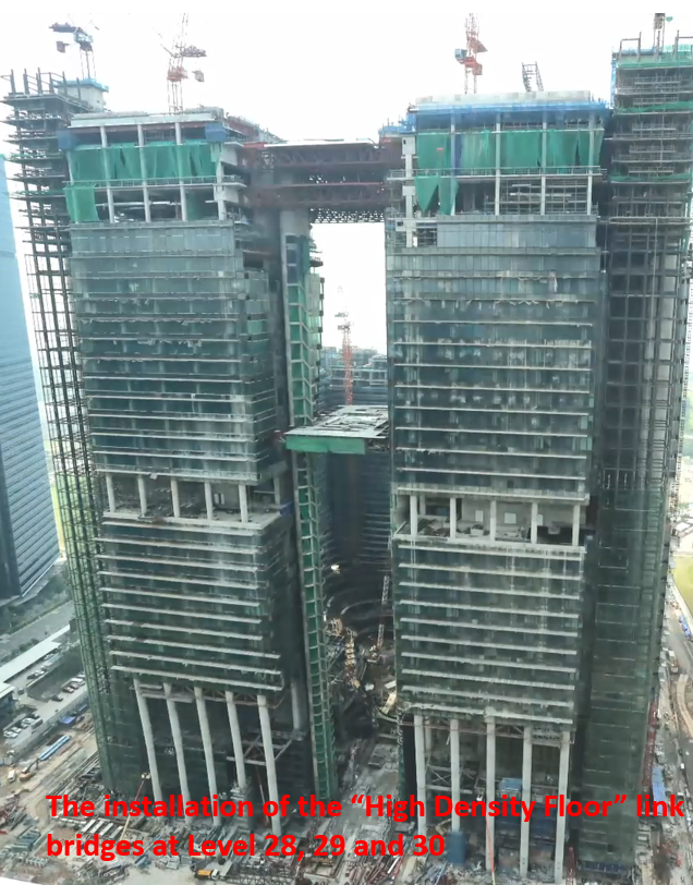 The two office towers are connected at the base via a 4-storey commercial podium building. The two office towers and the podium building are located atop a 4-storey below grade basement structure, full block, Parcels A2 and A3. Each of the office towers is 200 meters tall, measured from ground to the roof level. A typical office floor plate is approximately 4,100 square meters. The office towers are connected at levels 28, 29 and 30 with a sky bridge structure. The total floor area of the sky bridge structure is approximately 6,000 square meters. The gravity framing system at the podium and office levels consists of steel beams and a 130mm composite concrete slab on steel deck floor system. The steel deck will be Bondek II produced by Lysaght (selecting thickness of 1.2, 1.0 or 0.75 as required to avoid the need for propping wherever possible). At the more heavily loaded areas at the podium levels, a 200-mm (or thicker) composite concrete slab on steel deck floor system will be used. Inclined composite columns comprises of cast-in UC steel columns with reinforced concrete encasement. At the floor level – steel stubs welded to the UC steel columns formed part of the connection to the floor beams and trusses.