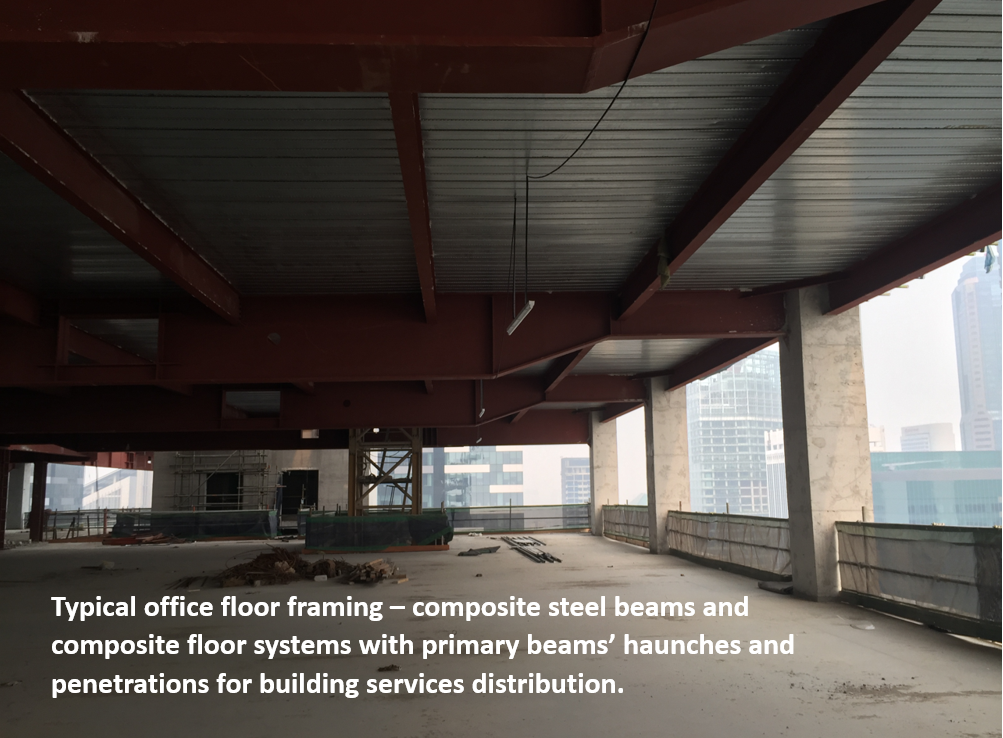 The composite structural steel framing with composite metal decking used for typical floors of the Office Towers was driven by construction programme and to achieve superior head-room requirements.