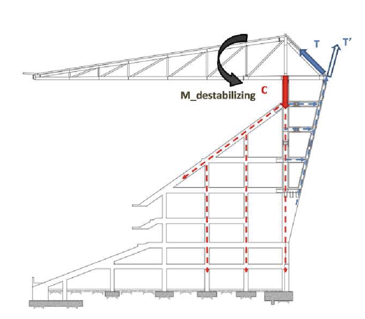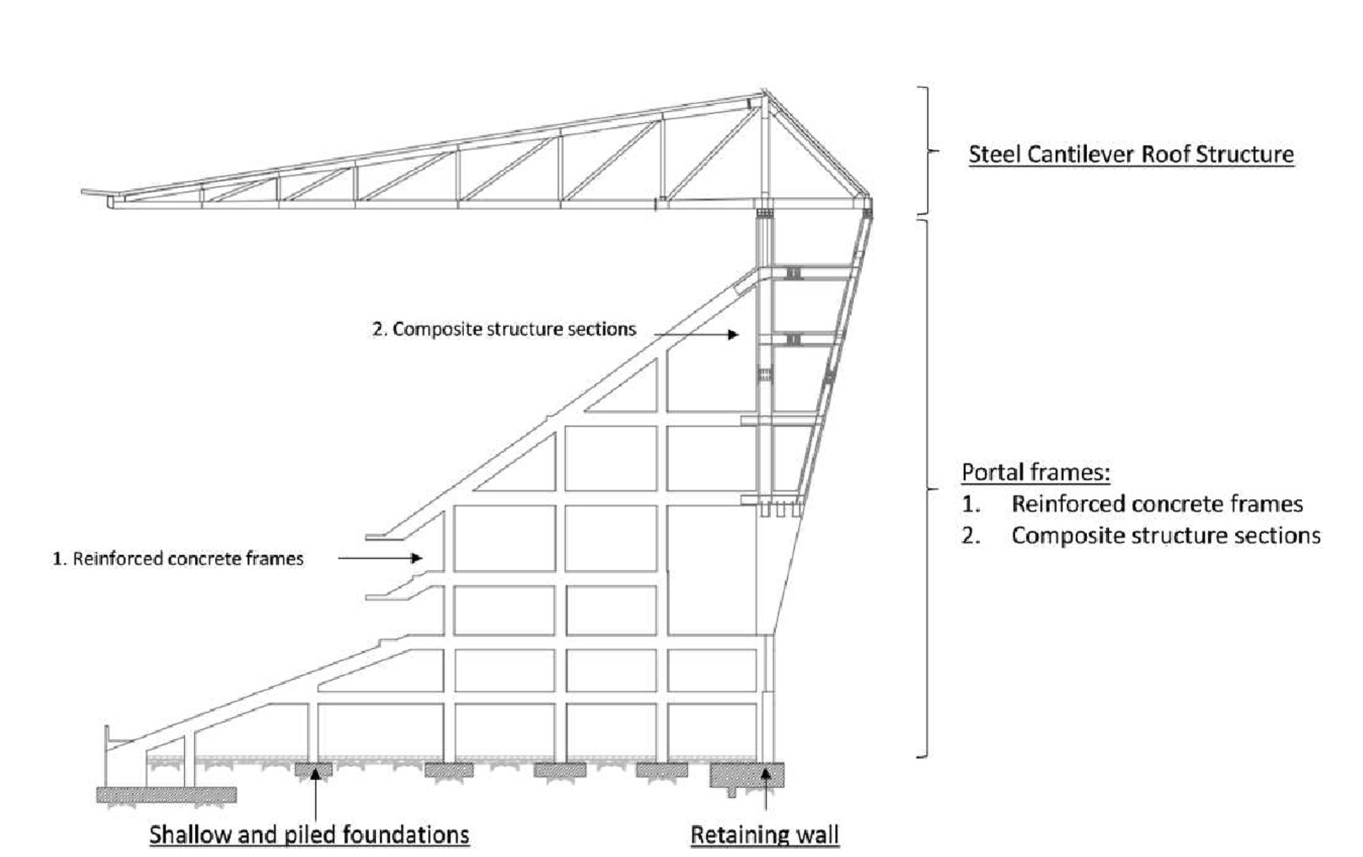 In the frames that hold the 55 meter cantilever a composite steel-concrete solution was adopted to cope both with moment acting on the portal frame and with the façade geometry that, at that height, creates a 7 meter deep cantilever projecting the perimeter of the stadium outside its footprint. The system developed allowed the creation of self-standing roof elements that made possible the 2-stage construction sequence.
