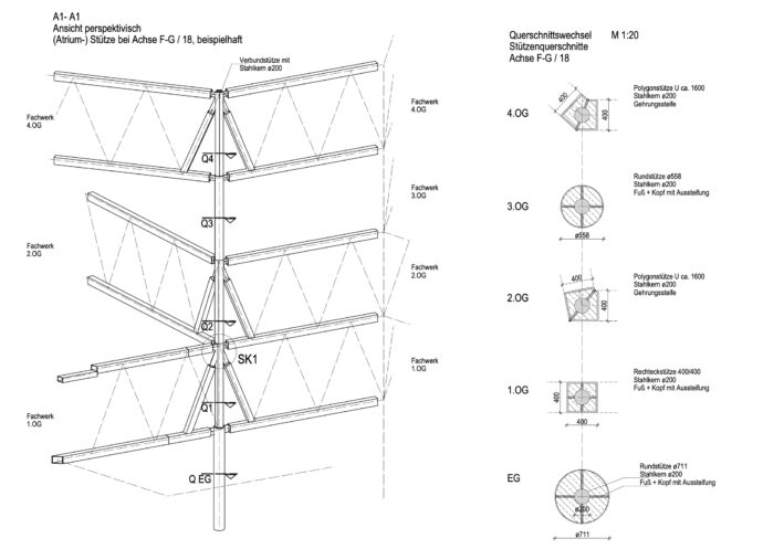 The support structure of the Experimenta Science Center in Heilbronn is characterised by floor-to-ceiling steel trusses, a central concrete core and 7 composite megacolumns that support the perimeter trusses. The goal of the design is to provide unobstructed column-free space inside the museum and a continuous path from the bottom to the top through the spiraling void and communication system inside (staircases and escalators).