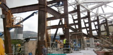 Columns are formed with composite construction up to a certain floor of the tower. 45Mpa concrete is used in conjunction with heavy sections of S355 steel, ranging from HD 400X818 at the level of foundations to 260×172 at the 17th floor. Above this level columns are in reinforced concrete.