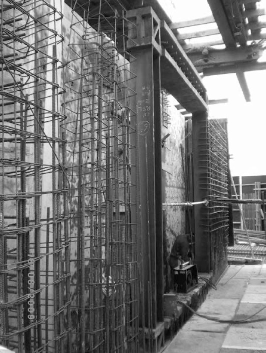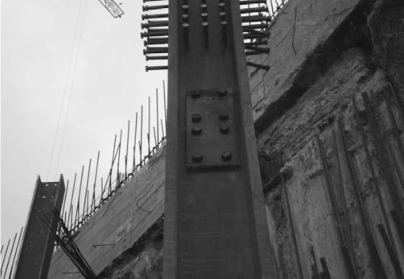 The composite columns have been designed considering that the embedded metal profile exclusively supports the axial force that corresponds to it due to the homogenization of the section, while the reinforced concrete section supports the rest of the axial force and the entire bending moment. To prevent the metal profile from supporting torsion forces, the connections between consecutive sections of metal profile have been designed so that continuity of moments is not allowed in order to simplify the joints, although the existence of total contact at these points. These joints were located 1.50 m above each floor level. The transmission of the axial from the slabs to the metal profiles is carried out by the connectors welded to the profiles under each concrete slab. In the core, the use composite lintels resolved the problems to limit the horizontal deformation of the core and maintain the comfort limits, in addition to supporting the distortion of the profile itself without causing damage to the slabs.
