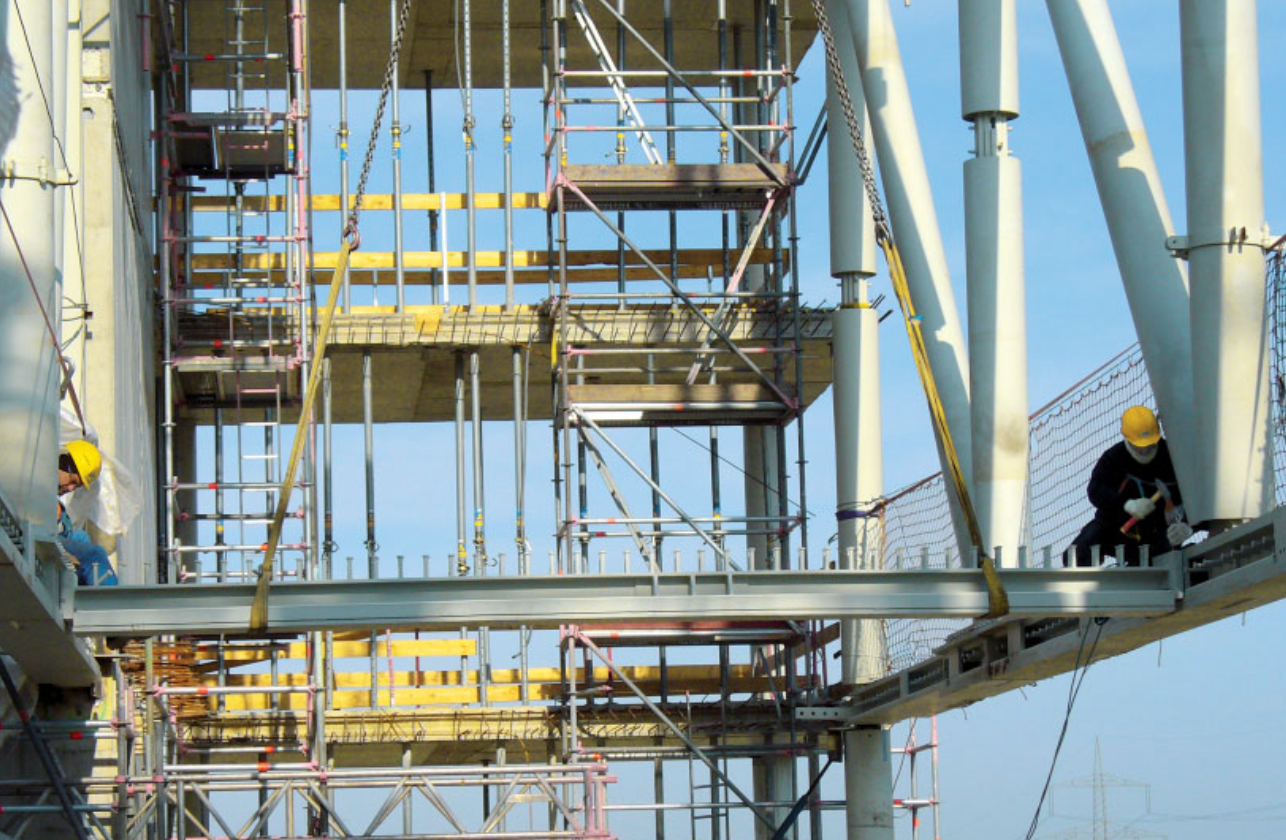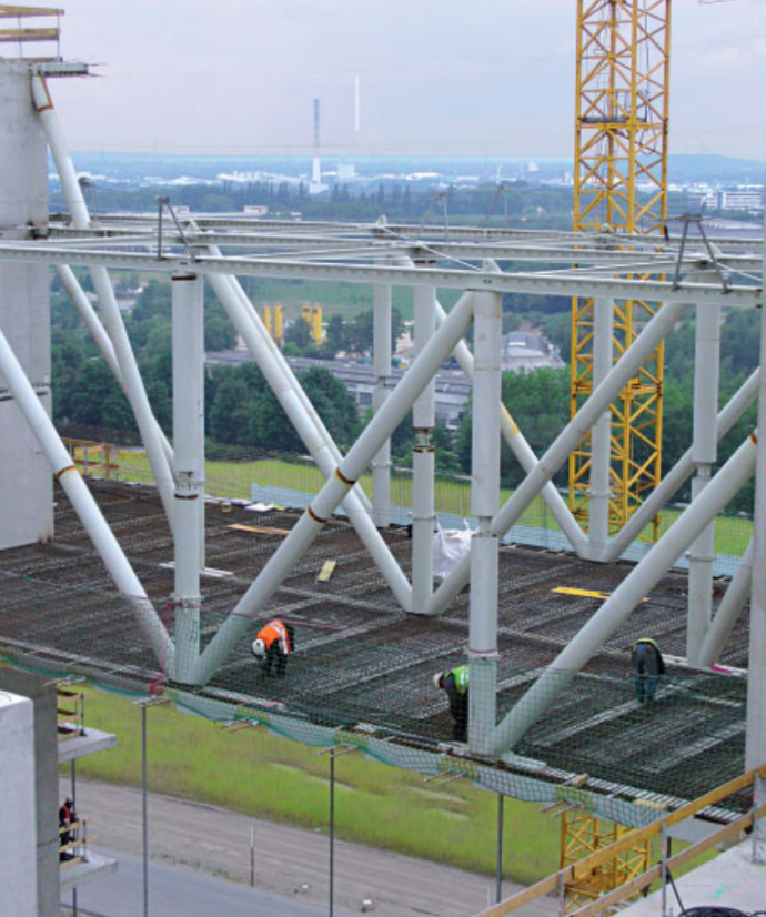 The truss is 31 meters in span and 7.7 meter in height. The upper and lower chords made of welded T and H -Profiles are integrated into the flat ceilings. The slim filler rods (posts and diagonals) consist of concrete-filled steel jacket pipes with adjustment profiles. The node points were designed structurally within the ceiling and the casing pipes in order to emphasize the slenderness of the individual supporting members and the transparency of the overall truss construction.