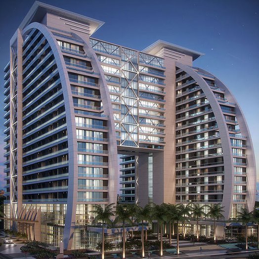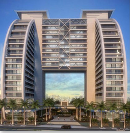 The steel structures of the north tower and the south tower were erected. Later, steel trusses together with the slabs were lifted and positioned on upper floors, connecting the two towers.