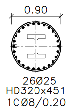 The solution adopted consists of a heavy HEM profile encased in reinforced concrete. The steel is S355 with sections ranging from HD320x451 to HD320x127. HA-50 concrete is used to create the columns that range from 70 to 90 cm in diameter. Depending on the floor level of the column range from, the reinforcement of concrete is made with 26 rebars with 25mm of diameter down to 14 rebars with 20mm of diameter, confined by a 8mm stirrup.
