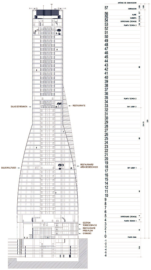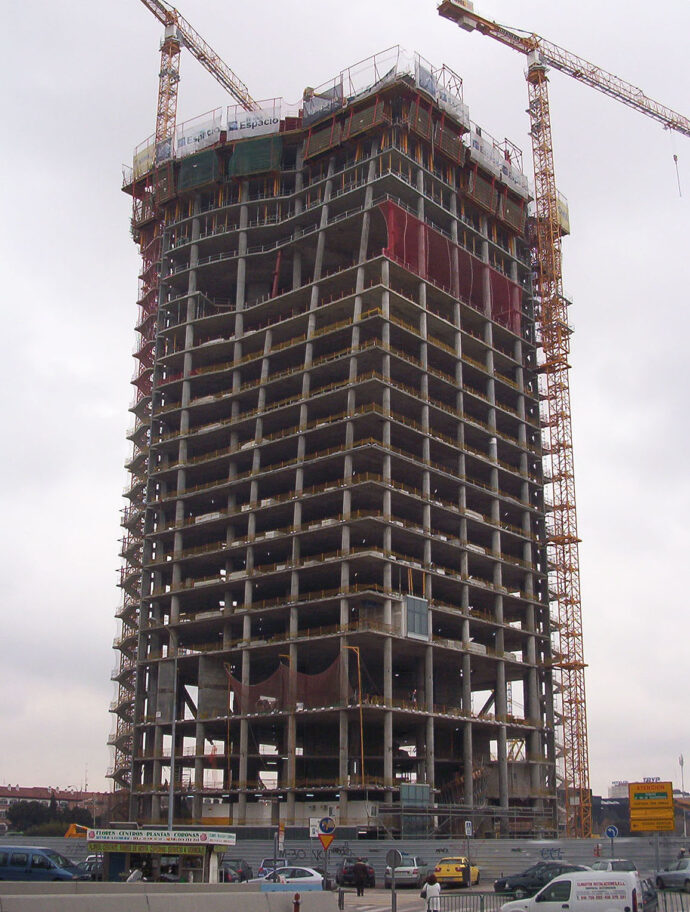 The promoter and owner of the project, Villar Mir Group, set out some rules that influenced the design, such as the use of concrete for the main parts of the building. Despite this decision, some parts had to rely on the properties of steel to simplify the size of the load bearing elements. Among these, the steel trusses supporting the lateral columns above the lobby and the composite elements in the mid rise area of the columns. In the latter case, a composite solution was used. Also the steel truss beams act compositely with the floor slab above and below, by means of steel cables dissipating the stresses through the slabs. A detailed description of this is provided in the referenced study.