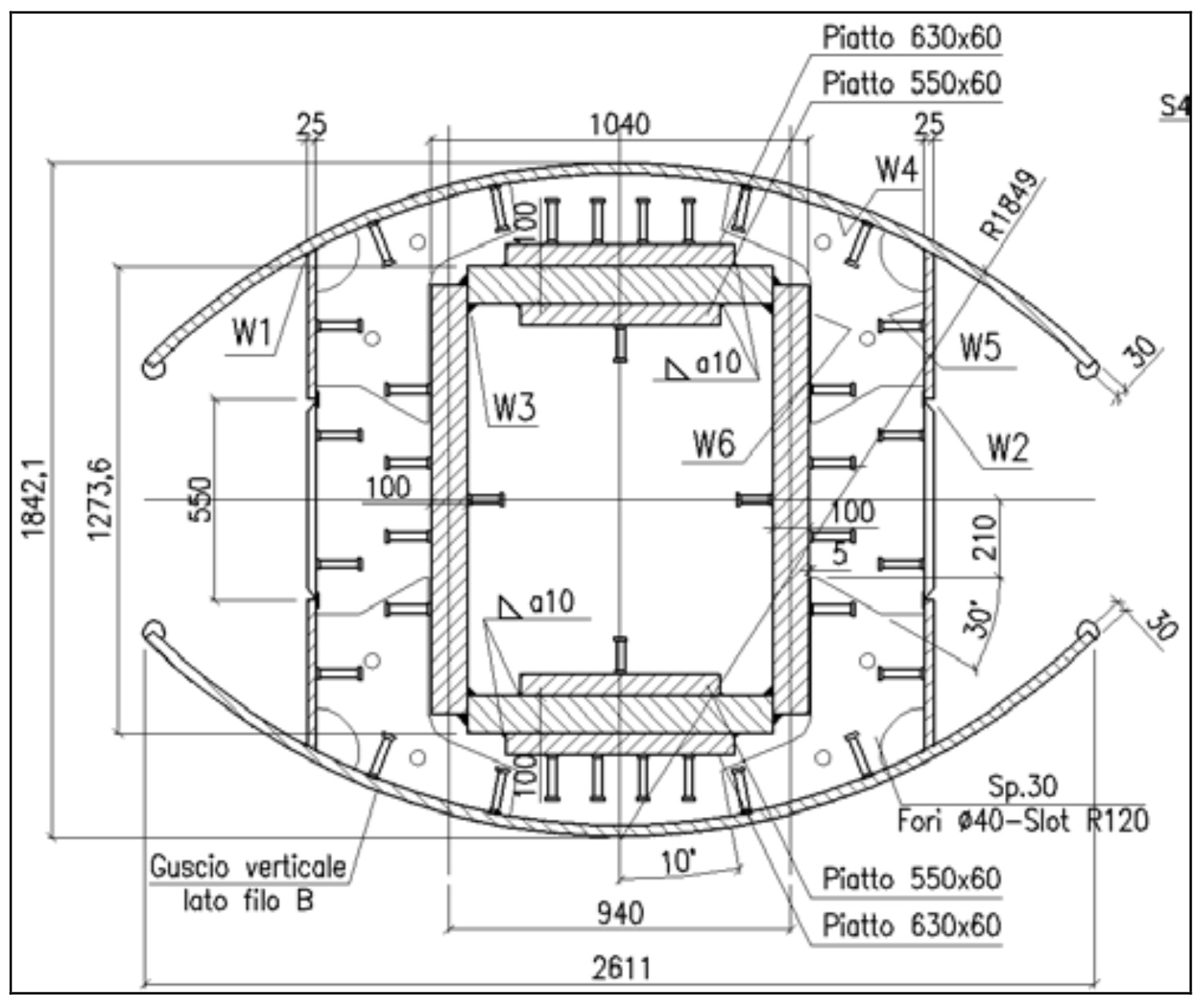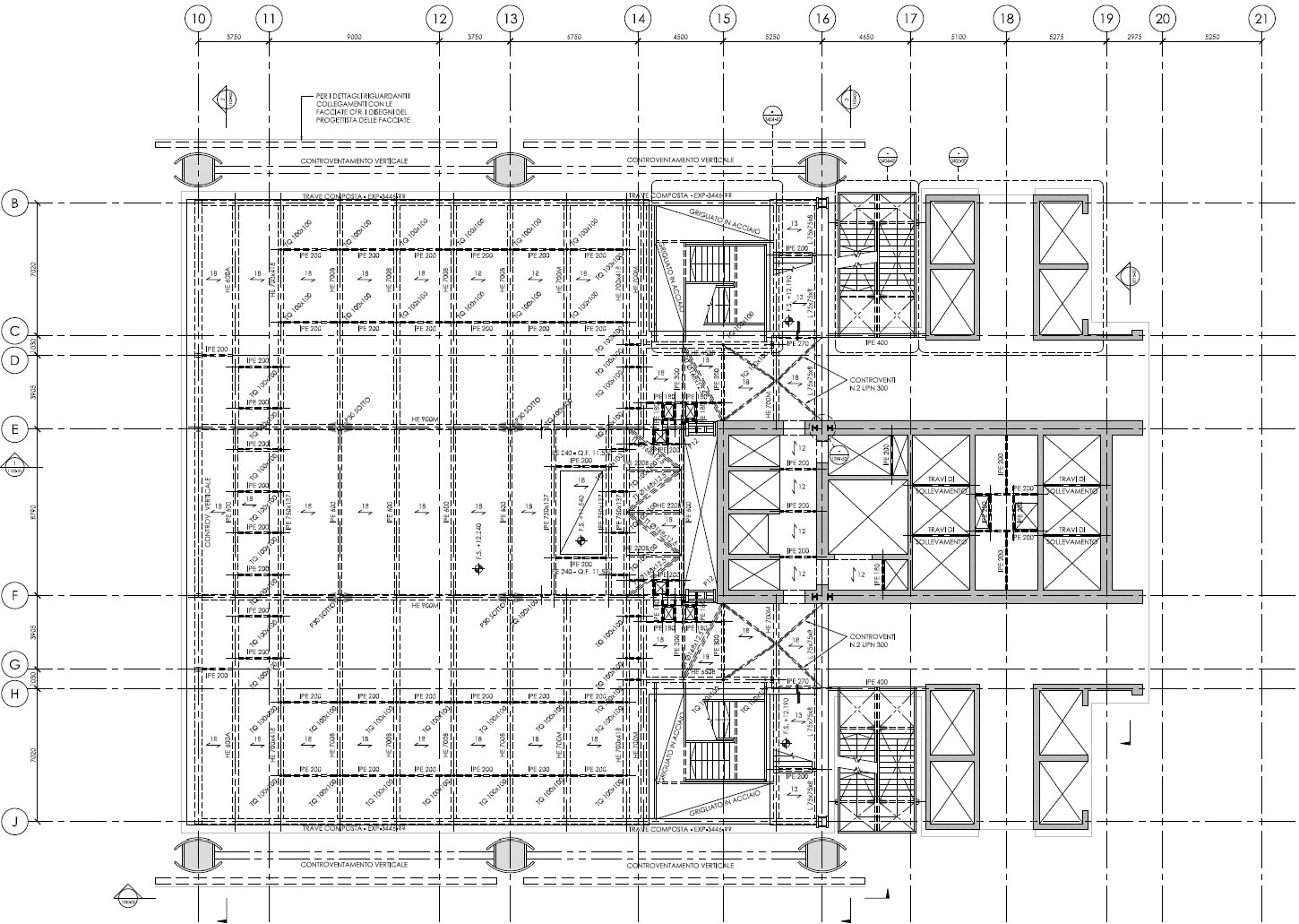 The 6 composite mega columns are thus composed of two curved steel blades that hide the column itself. The column is composed by S355 and S460 steel plates connected to the concrete by means of shear connectors. The plates form a square hollow section and concrete is poured on both faces, so that the composite action is fully exploited on both sides. The external curved steel profiles enclose the whole system, and they are connected too by means of shear studs with the concrete pour. The six mega columns are spaced 16,5 one from the other. The external curved profiles have a thickness of 30mm and are curved with a radius of almost 2 meters and they are spaced with 30mm thick plates creating and hollow square in the center. Each mega column has a total footprint of 2.805×1.968 mm. The steel plates inside the external curved elements have a thickness of 100mm and are further reinforced on the shorter direction with an additional plate of 50mm on each side, for a total of 200mm of steel. From the 7th floor above grade (after the huge transfer beams) the internal plates decrease in size, transforming in a X shaped reinforcement with a decreasing thickness from 100mm to 25mm at the top of the building.