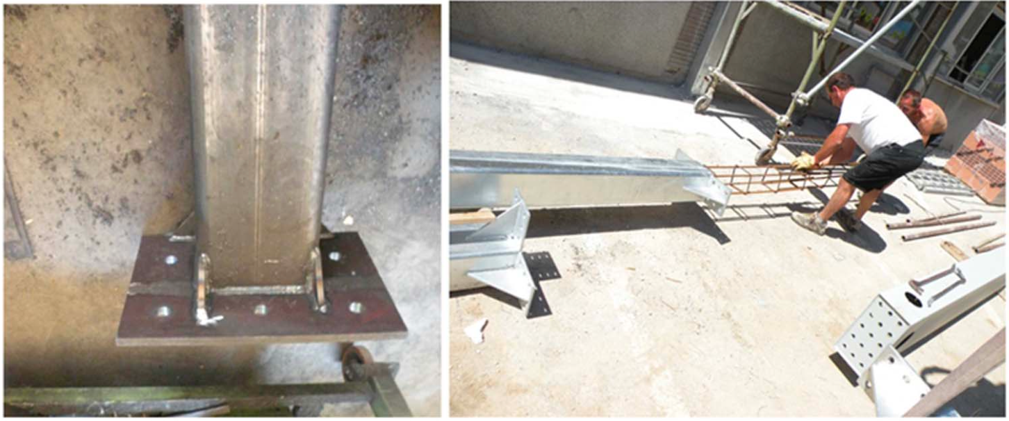 Concrete filled primary beams: each beam was composed by three different segments. The end pieces connecting the beam to the composite columns described above and a central segment, covering most of the span. The beam vertical section was formed by a thin-plate U section that allowed the easy welding of L-shaped shear connections. The concrete pour included the use of additional horizontal rebars. Secondary beams (steel only) were bolted to the primary beams before the concrete was poured.