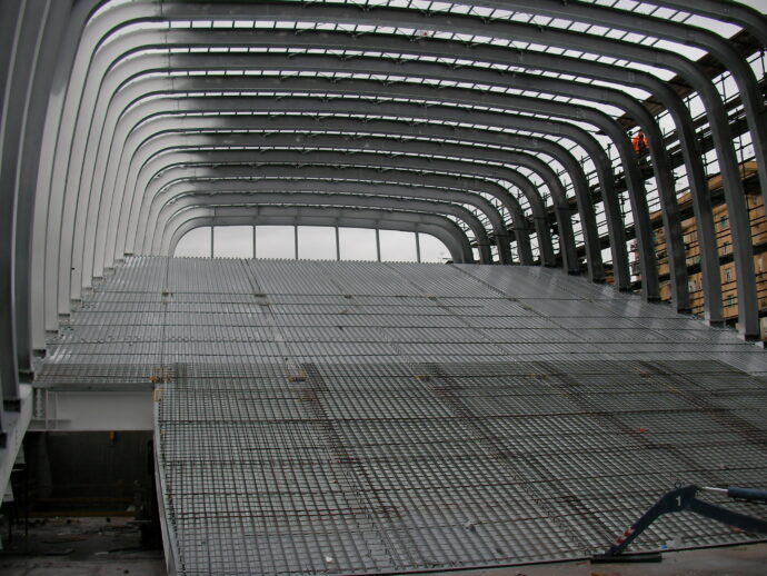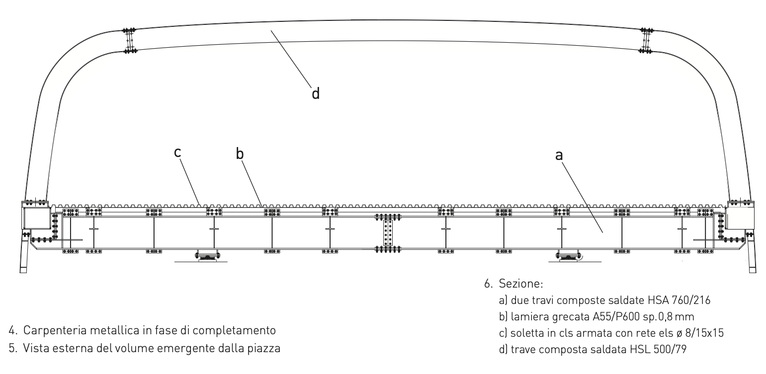 The inclined composite floor of the auditorium is supported by a frame spanning 7.9meters. Each frame is composed of two coupled HAS 760/216 beams, welded together, supported by concrete columns. The secondary beams are formed by either HSA600/180 beams (aligned with the concrete columns) and IPE 500 beams with a distance of 2,66 meters one another and finally tertiary beams made with IPE 240. The corrugated sheet (A55/P 600 with 0.8mm of thickness) and the concrete above works compositely with the beams by means of shear studs and a 8mm 15x15cm welded wire mesh.