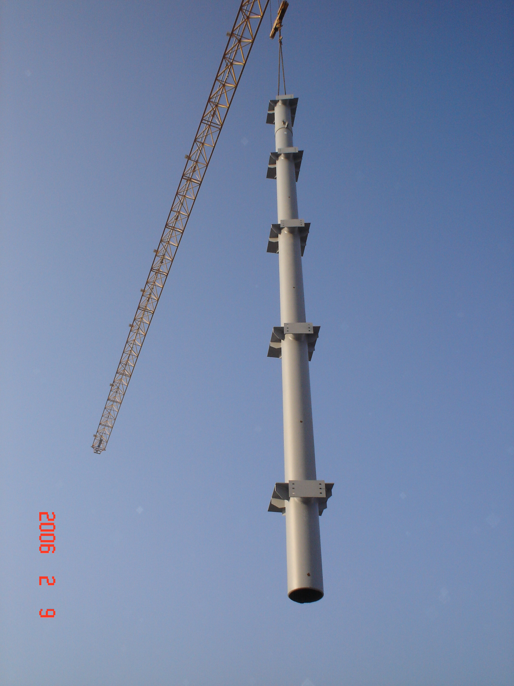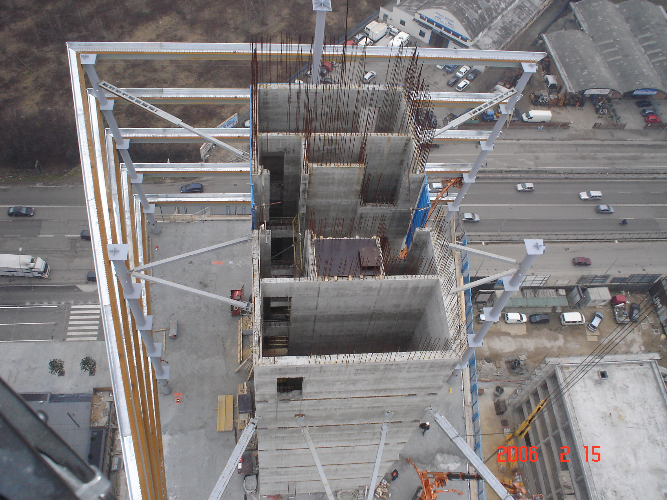 The building is supported by rc concrete core and 8 steel columns bade of hollow steel tubes. 4 of these columns are perfectly vertical, 4 are slanted, creating the unique shape of the whole building. Due to this architectural feature, each of 22 the floors slabs of the tower has a different shape. The cost of building a conventional steel structure with beams and metal decking would have been too high due to the need to create too many unique elements.