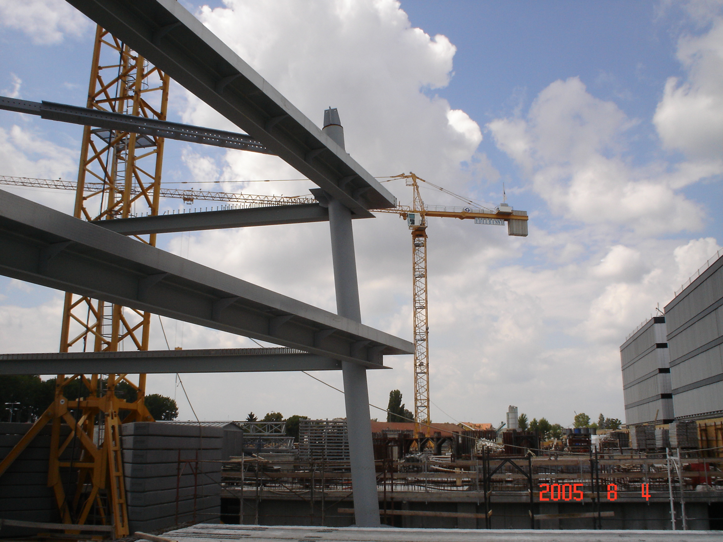 1800kg/mq lightweight concrete used to create a 25cm thick slab for unobstructed floor spans up to 14 meters from core to windows. The slabs act compositely with the steel beams thanks to Nelson studs, disposed on two layers near the columns and one layer in the midspan. The steel beams are created by welding together two different T shapes, with the lower one (tension) thicker and broader than the above (compression) one.