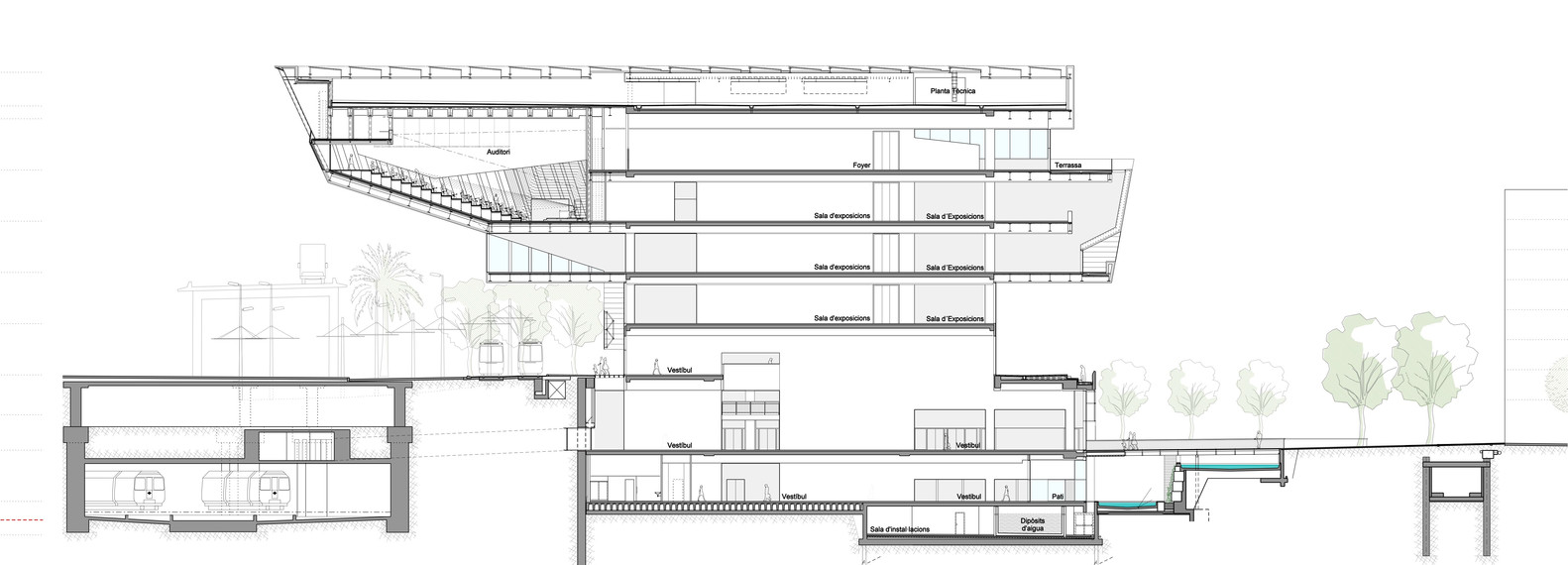 The DHub – Barcelona Design Center building unifies the collections of 4 other museums in a new, larger structure. With an exhibition space of 6000 square meters and the rest dedicated to archives, auditorium, and public spaces the museums is characterized by a very small footprint, due to the need to avoid the occupation of the park that was planned in the immediate surroundings and not to interfere with the railway operation happening in the basement.