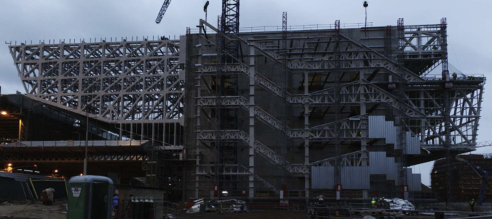 The cantilever is realized with a steel truss, while the floors of the auditorium are built with composite construction.