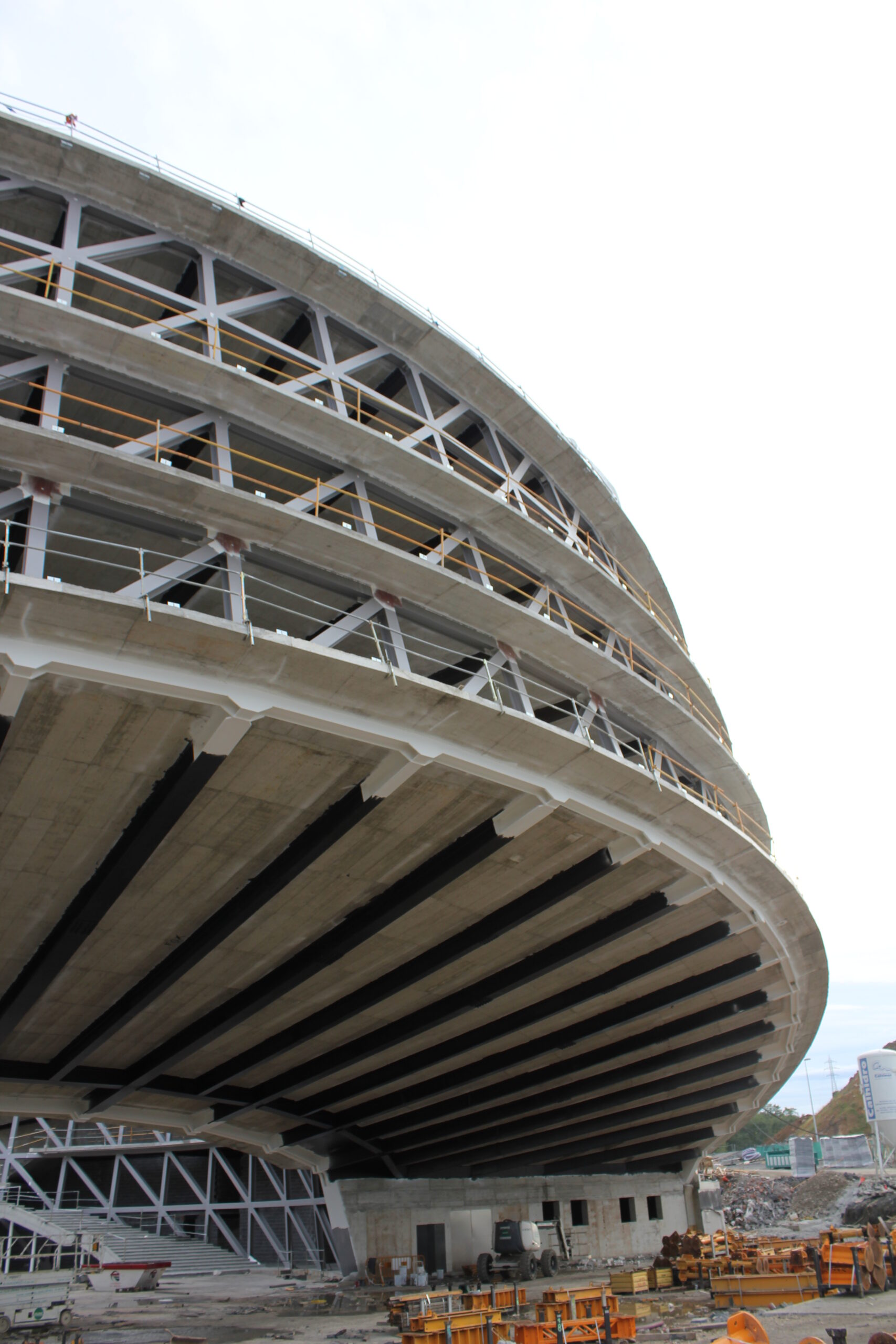 The composite floor solution is formed by the main steel ribs that connect the inner and outer circle and a collaborative concrete slab. This cast-in place solution prevented the use of very large irregularly cut corrugated steel sheets, while creating at the same a very stiff solution. Timing the deflection of the 20+m long free span of the lower floor.