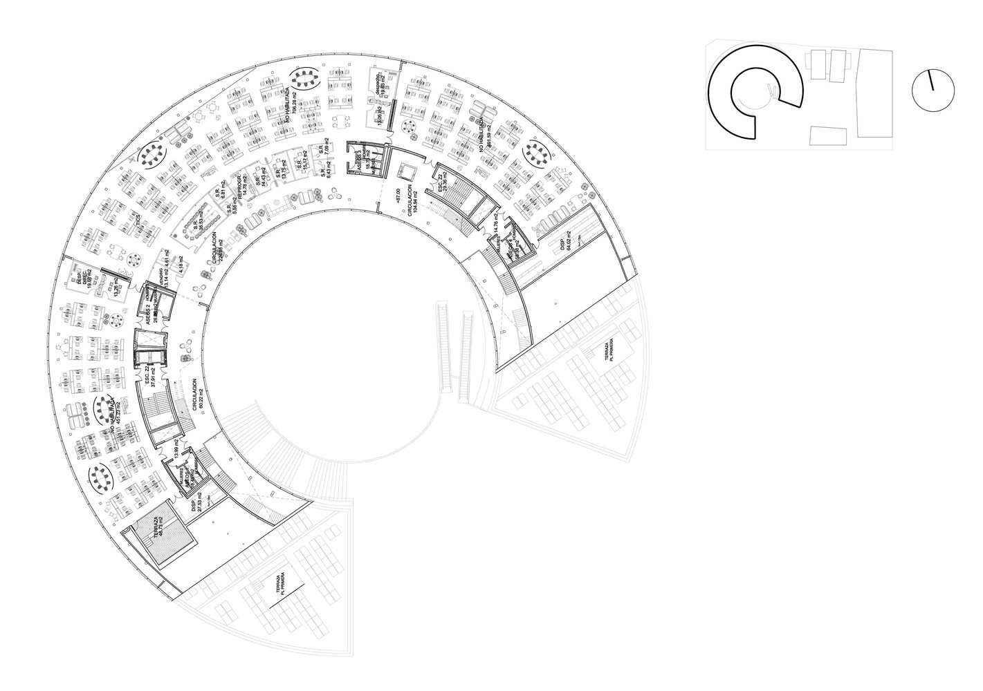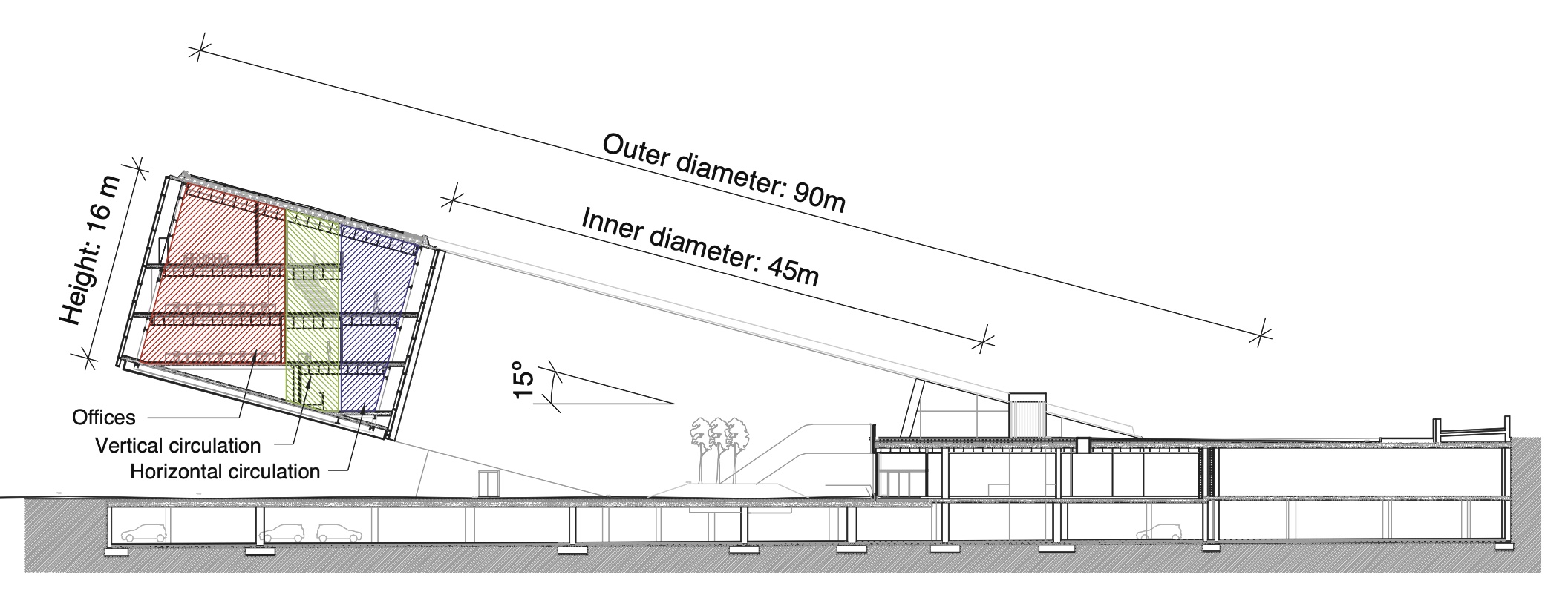 The building is the headquarter of the Orona Lift Industry, as well as the central point of a new campus creating a place that is both a flagship and a common home for its more than 4,500 employees and a hub for researchers and students on its vertical transportation, urban mobility, energy and technology branches. The design of the building is made by a hollow cylinder of 90m in diameter and 16m in height. The cylinder is inclined 16° so that it looks like it is emerging from the ground, cantilevering with a surface of 1500m for about 30m above the entrance.