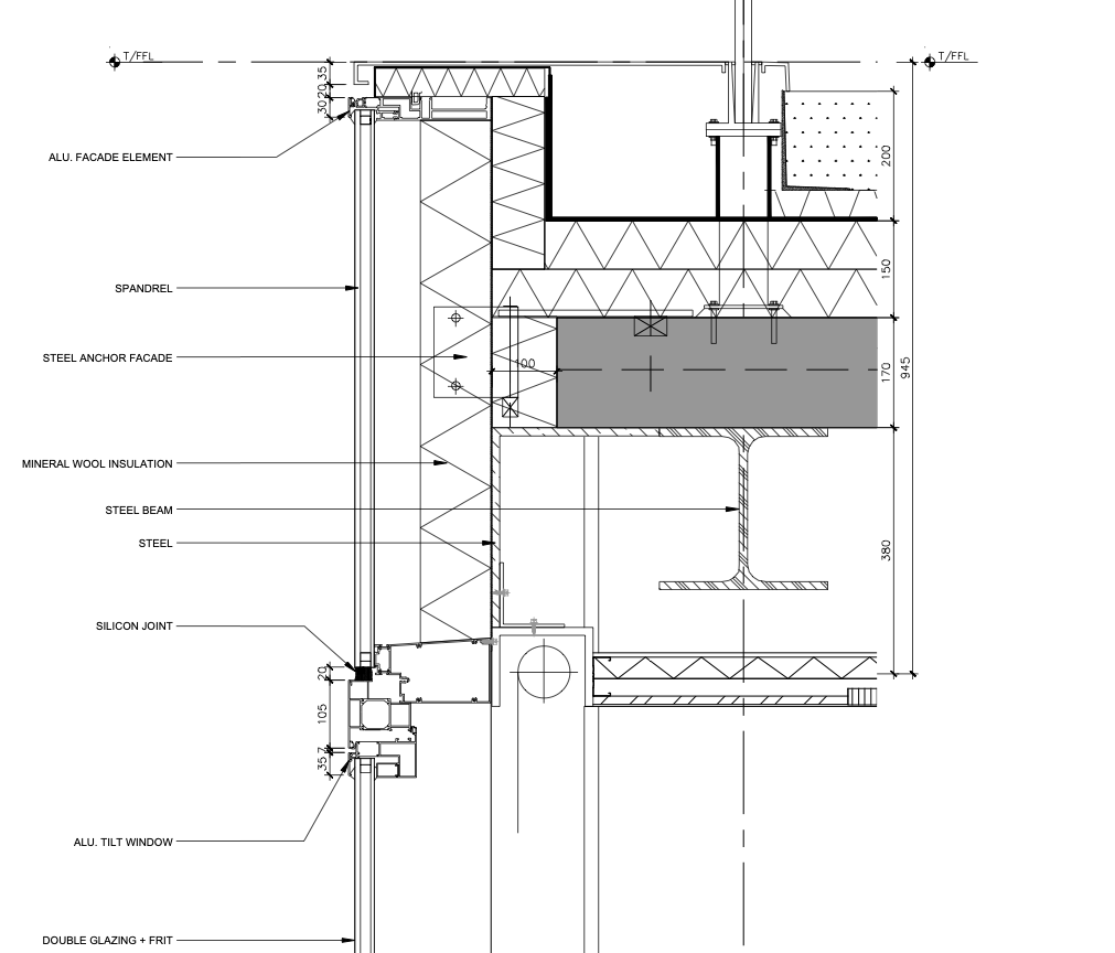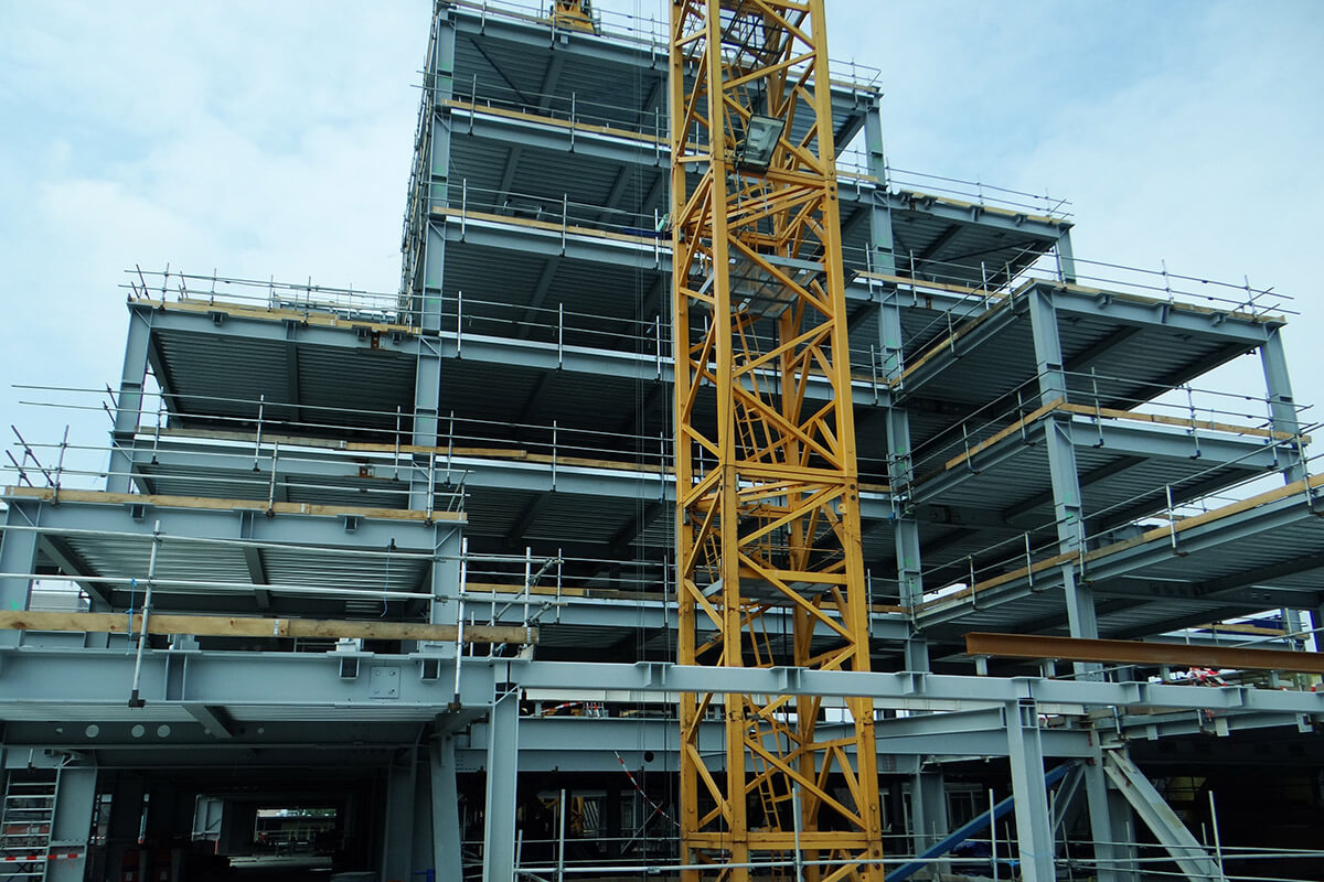 To reduce the thickness of the secondary beam within each module of 7.2 by 7.2 meters, the steel beam works compositely with the concrete decking in each module.