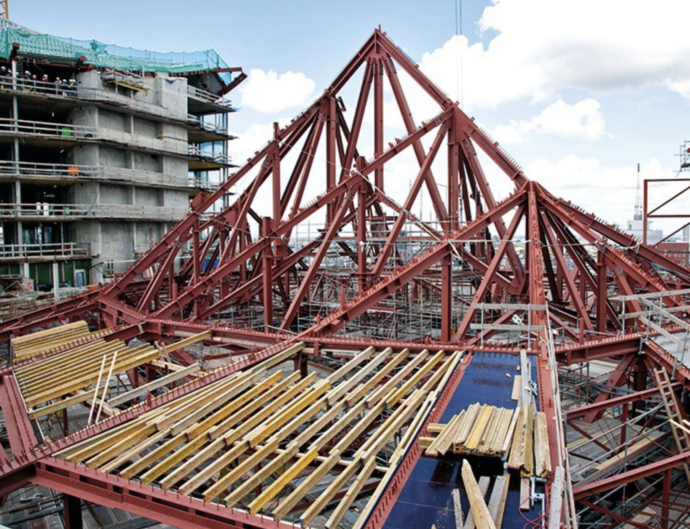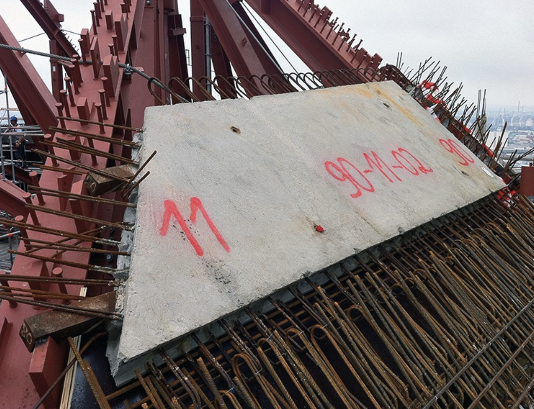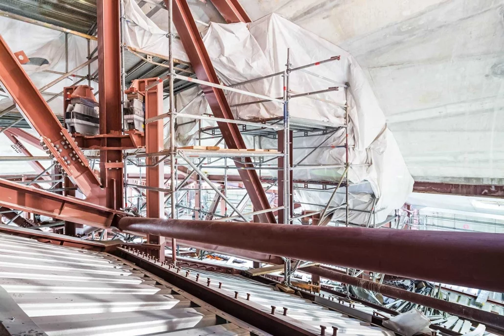 Thall roof outer shell spans the concert hall of the Elbphilharmonie with a span of 50 × 55 m². The construction consists of a 600 t steel composite space frame or space frame with variable construction heights between 2.0 m and 9.0 m and a supported concrete shell. The space framework consists of a total of 21 individual trusses, an inner ring truss (max Nd = 22,000 kN), two prominent star nodes and a ridge truss connecting the star nodes (max Nd = 30,000 kN). Six truss belts are connected to the star nodes in an area of 180° and are in balance with the ridge truss. Since it is a space framework, there are star nodes for the compression and tension belts. From the heavy support components in the surrounding solid outer shell at a height of 72.48 m, the space framework in the middle area with the ridge framework shoots up to a height of 91.5 m. The construction is stressed by the building roof, the technical level that creates the space between the building. A 20 cm thick, hat-shaped concrete shell is placed on the more ascending part of the truss, which is also connected to the top chords via head bolt dowels. This ceiling consists partly of prestressed precast concrete elements that span from truss to truss, and areas that could only be constructed using in-situ concrete.