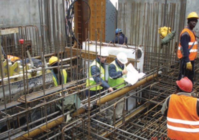 The Tower has two concrete cores. Each one is 10m in the east-west direction and 23 in the north-south one. Concrete wall vary in strength from 55MPa to 40 mPa and their thickness varies from from 1.2 meter for the main perimeter walls to 0.3m of the internal partitions. The steel reinforcing elements inside the cores are with S460NL sheet steel shapes up to 100 mm thick, supplied from the shop in sections weighing up to 360 kN. These elements work compositely with the concrete by means of shear studs.