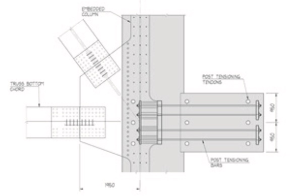 The horizontal forces from the trusses are a result of several conditions. Under gravity loads only, the trusses will induce a moment at the cores. The bottom chord and end diagonal of the trusses will push the cores apart, while the top chords will pull the cores together. Under wind loads, the moments the trusses induce in the core walls will re- verse depending on wind direction. The horizontal loads from the trusses are eccentric to the centroid of the cores. To force the core walls to act as a unit and resist the horizontal truss loads, the cores are tied together with a 1.9 m diaphragm slab at each top and bottom truss chord. The diaphragm slab is post-tensioned in both directions to transfer the horizontal loads to all the core walls. The post-tensioning of the diaphragm slabs is a sequenced procedure that progresses as the floors above each truss level are constructed. To minimize the magnitude of moment the trusses induce in the core under gravity loads, the bolts in the top chord connection of the trusses to the core are not fully tightened until all the dead load has been applied to the truss.