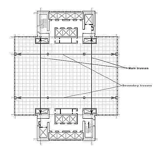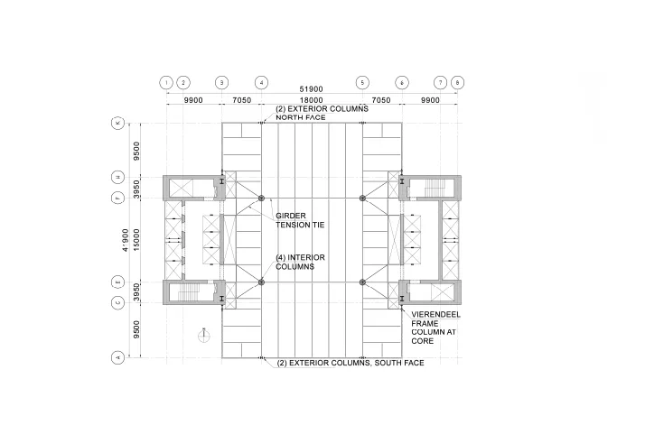 Every 11 floors all the forces brought by the columns are shored to the two lateral cores by means of two 2-story height steel trusses. These two trusses are complimented by two additional Vierendel trusses, orthogonal to the main ones, that support the floor plates cantilevering out of the main perimeter of the tower.